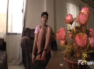 Horny tranny with pink fishnet stockings masturbates and fists her ass on the chair