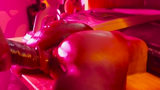 Furry in drag plays with bad dragon toys