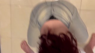 A big-assed girlfriend in jeans gives a blowjob on the balcony