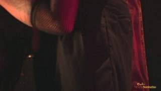 A busty brunette ties a man to the cross and makes him lick her pussy.