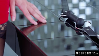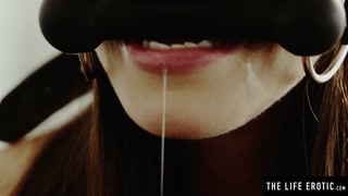 A gag in her mouth and her fingers in her pussy as she orgasms