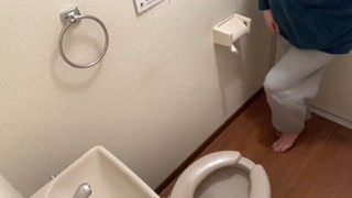 A girl wearing a hoodie rushes into the bathroom on the verge of peeing