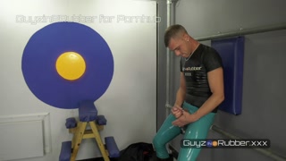 A hot Rubber-clad, booted guy in a biker jacket using a fleshlight on his huge cock to help him cum