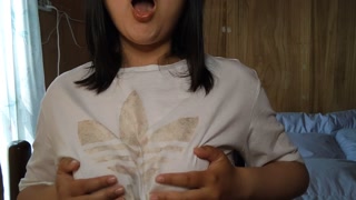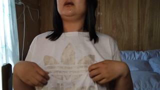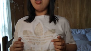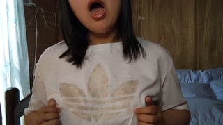 A Japanese woman drooling in a white T-shirt and masturbating with her nipples💓