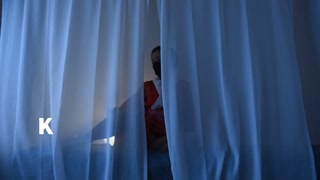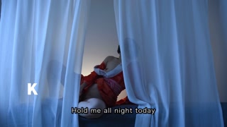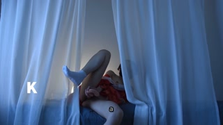 A mature woman with Japanese hair wearing a red undergarment masturbates alone in the dim light.