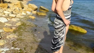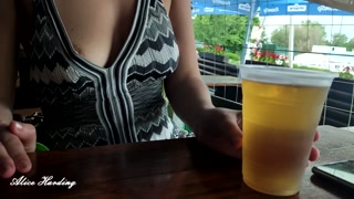 Alice bares and shows her breasts and pussy, outdoors, on the beach, in the apartment and in the bar