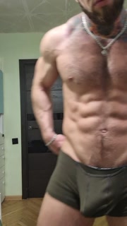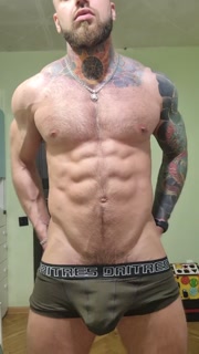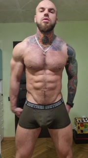 Bald tattooed jock flex muscles and jerking