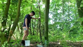 Balls stretching outdoor with bucket filled with water and jerk off