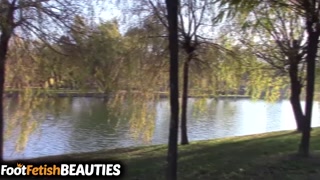 Barefoot brunette shows off her feet in public in the park