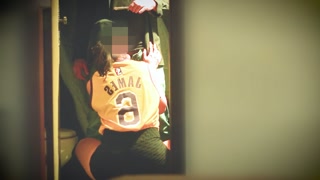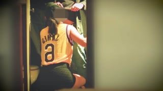Basketball player gives coach a blowjob in the bathroom at the back of the gym.