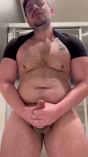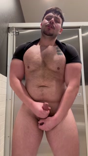 Beefy man in public restroom strips down spits and jerks on thick cock before cumming