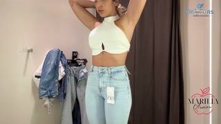 Big ass blonde trying on jeans