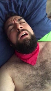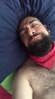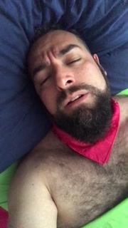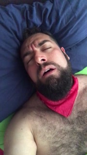 Big bearded and hairy bear wanking rubbing the bed sheet on his hard and wet cock. Beautiful Agony