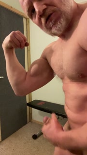 Big muscle stud bicep curls heavy 20kg dumbells, flexes, jerks off and cums!