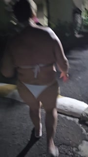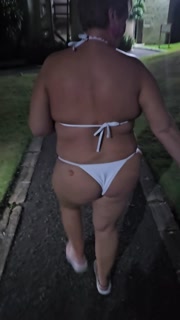 Bikini wearing BBW MILF walking and stripping