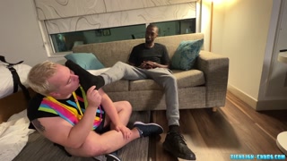 Black dudes feet are licked and worshipped by chubby bear