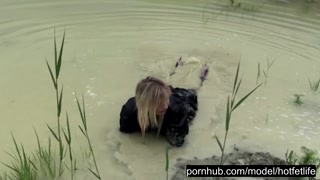 Blond Girl In Black Rubber Catsuit Bathes In The Mud And Rips Her Latex Catsuit
