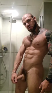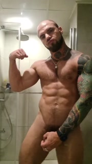Bold tattooed jock flexing in bathroom and jerking massive cock