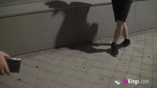 Busty nerd redhead looks for guys to suck in a public street