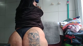 Busty smoking in the laundry room