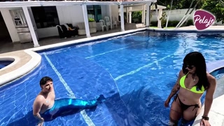 Chica lonely in pool fucks with a mermaid with legs and huge bigheaded cock