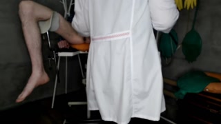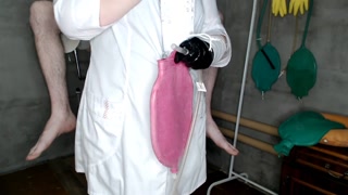 Chubby beautiful nurse gives a 1.5 liter enema bag to the patient