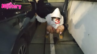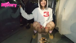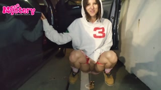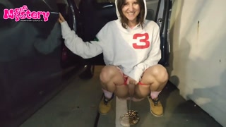 Crazy college girl pees in the parking lot of the store