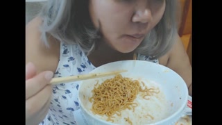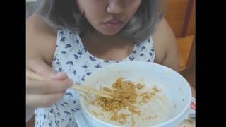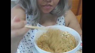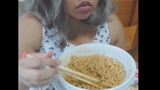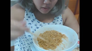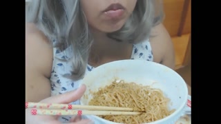 Cute feedee eats noodles for her feeder