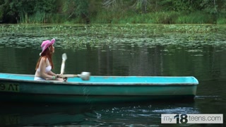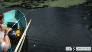 Cute girl decided to go fishing and caught a dildo and fucked herself in the boat