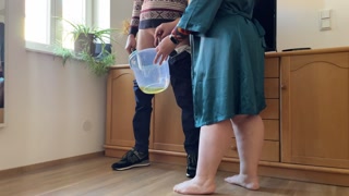 Dear mother-in-law takes off her panties and pees with her legs wide open in a bucket next to her so