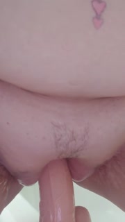 Dildo in pussy on bathtub edge