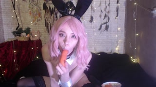 Easter rabbit having fun with too big carrot