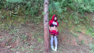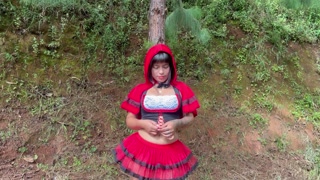 Elizabettracy, dressed as Little Red Riding Hood, is looking for a werewolf who will detonate her as