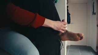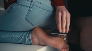 Ester tortoures his dick from behind before letting him cum on her soles