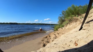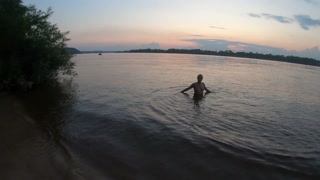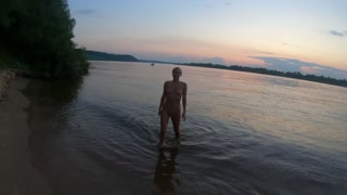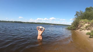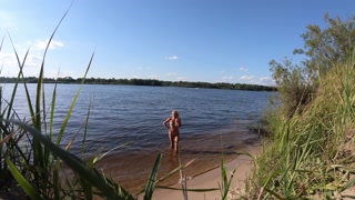 Fishermen swim past a beautiful nudist woman
