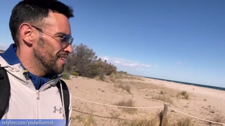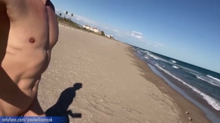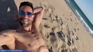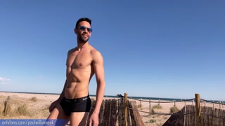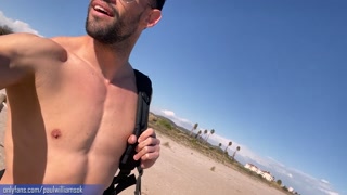 Fitness young man gets naked on Barcelona public beach after gym workout
