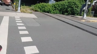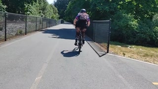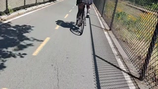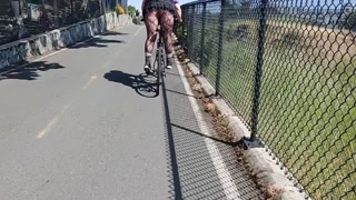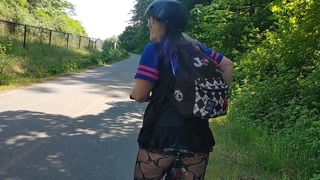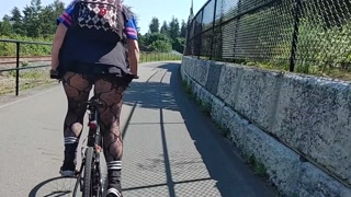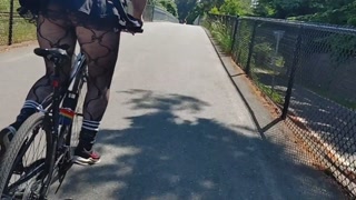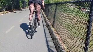 Following woman in mini skirt and fishnets biking