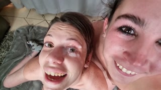 Getting a cumshot in my eye just for a chubby slut to lick out | FFM threesome | double handjob