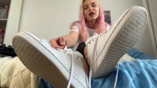 Giantess in black leggins sniffing her smelly trainers after long walking