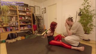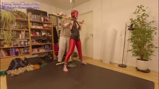 Girl in crotch rope predicament, tied in standing spread eagle and spanked