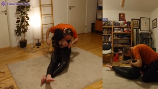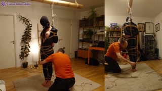 Girl in leather catsuit gets Shibari energy tied, suspended, nipple clamps. Real uncut play!