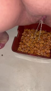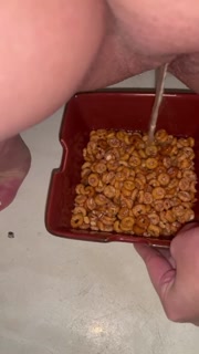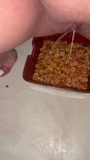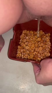 Girl pees in a bowl of cereal