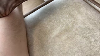 Girl pesters guy and lets him cum on her feet in black fishnet tights