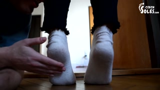 Girl workout feet and socks smelling (foot smelling, foot worship, small feet, naughty feet, soles)