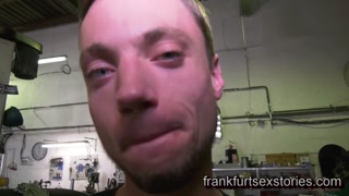 Horny customer sucks off monster cock and eats cum in a garage