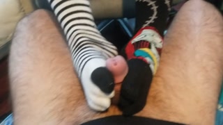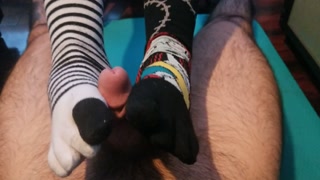 HORNY MILF GIVES NEIGHBOR A SOCKJOB UNTIL HE CUMS ON HER FEET