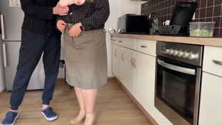 Horny mother-in-law sucks and masturbates in the kitchen and gets a load of cum on her gorgeous ass