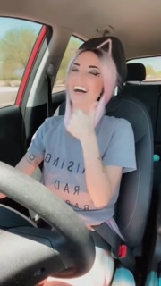 Hot tattooed girl driving around topless gets shy