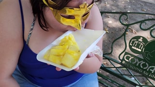 I suck my man's ass, cock and balls, extract a lot of cum and eat it with pineapple in public