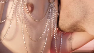 I touch my tits sensually with an harness and my boyfriend eats them with desire